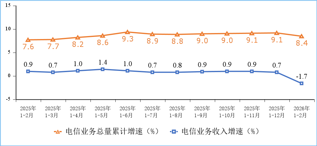 电信业务收入同比下降1.7%;电信业务总量同比增长8.4%。