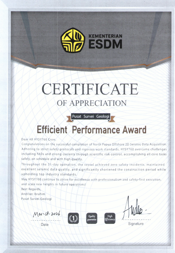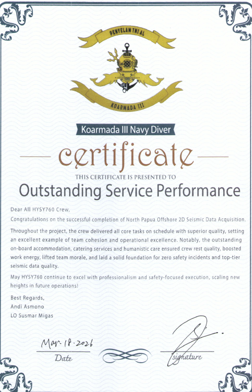 当地时间3月19日,中海油服“海洋石油760”圆满完成印度尼西亚地质局(PSG)North Papua海域二维地震数据采集服务项目。中海油服凭借安全、高效、优质的作业表现,继2026年1月后再次荣获印尼能源矿产部授予的“卓越表现奖”,并收到印尼政府及海军等多方表扬信,充分展现了中海油服物探团队深耕印尼市场、持续提升国际化服务能力的良好成效。
