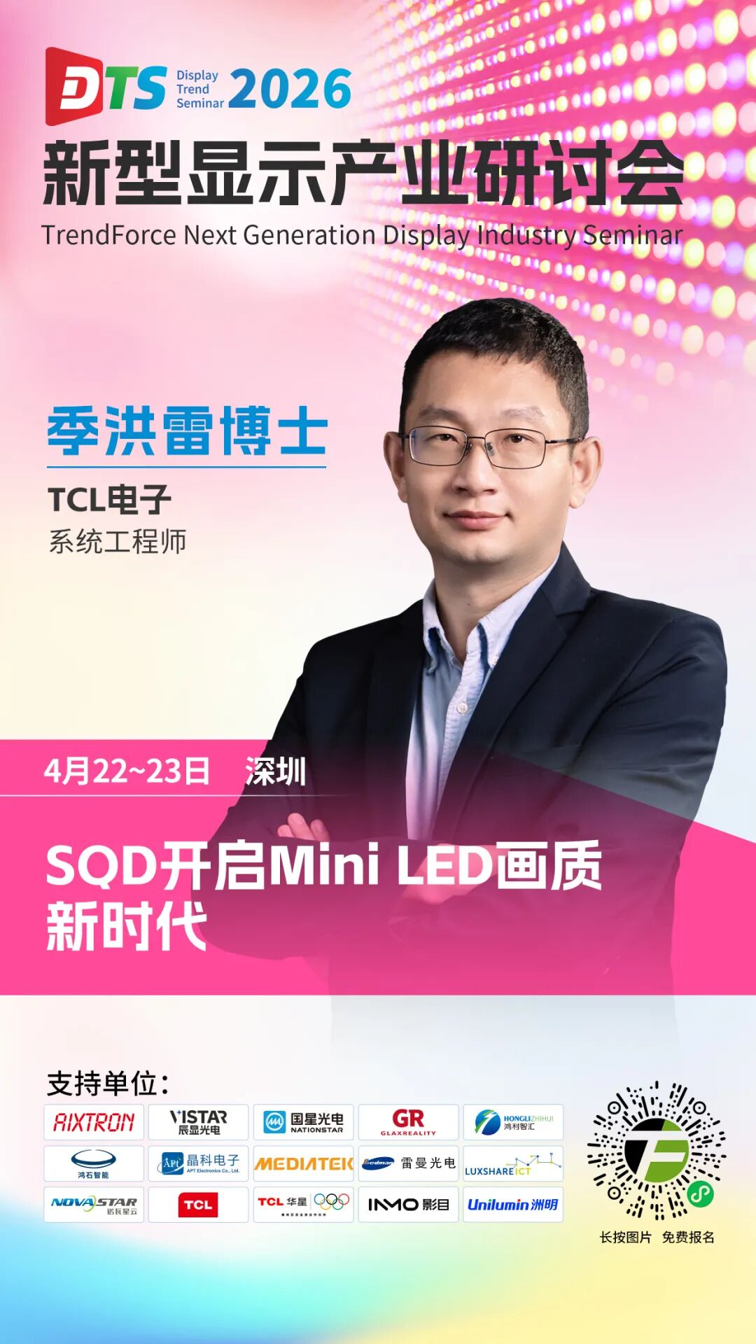 TCL SQD-Mini LED技术背后有哪些不为人知的故事,开启全民好画质时代的底气又来自哪里?在4月22-23日举行的2026新型显示产业研讨会(DTS)上,TCL电子系统工程师季洪雷博士将以“SQD开启Mini LED画质新时代”为主题,为大家揭开极致画质背后的秘密。