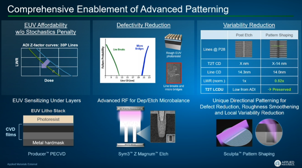 图案成形:英特尔首席工程师 Curtis Ward 强调了后处理技术,以缓解源设计限制,并引用 Centura™ Sculpta™ 图案成形系统为例,说明该系统可改善关键尺寸的尖端间距并减少变异性。