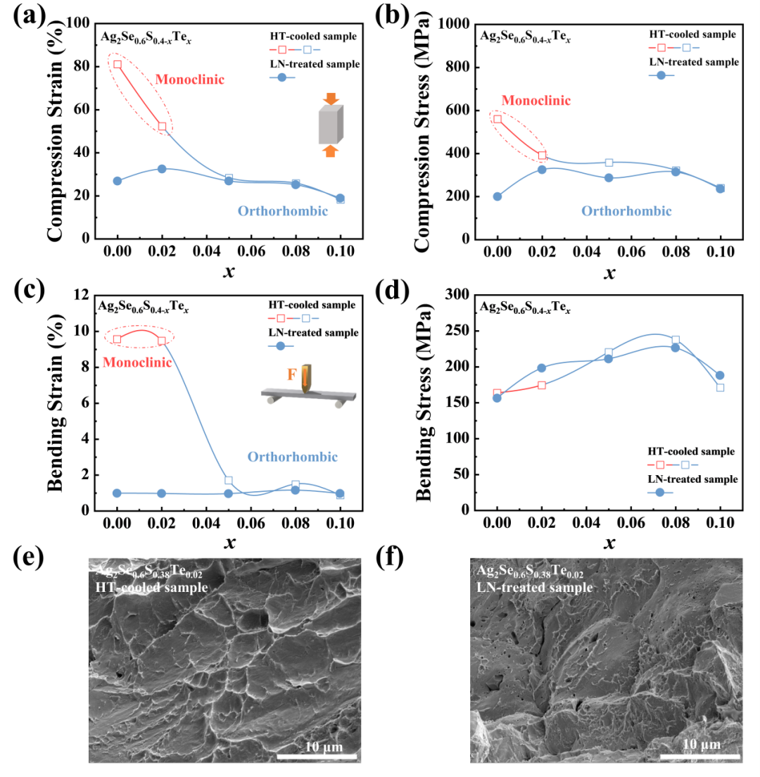 图5 Ag2Se0.6S0.4-xTex的力学性能。(a) 压缩应变,(b) 压缩应力,(c) 弯曲应变,(d) 弯曲应力随HT冷却样品和LN处理样品Te含量的变化图。(e) HT冷却和(f) LN处理的Ag2Se0.6S0.38Te0.02样品断口的扫描电子显微镜图像。图5a和图5c中的插图分别为压缩图和三点弯曲试验图。