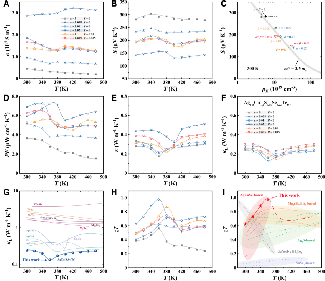 图2 Ag1-αCu1-βS0.08Se0.22Te0.7的热电性能。(A)电导率;(B)塞贝克系数;(D)功率因子;(E)热导率;(F)晶格热导率;(H)热电优值。(C)霍尔载流子浓度与塞贝克系数的关系曲线。(G)晶格热导率与经典热电材料及AgCuX基材料的对比。(I)热电优值与经典无机塑性热电材料的对比。