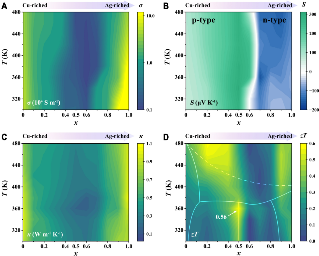 图1 (AgxCu1-x)2S0.08Se0.22Te0.7的热电性能温度和Ag含量x的变化关系。(A)电导率;(B)塞贝克系数;(C)热导率;(D)热电优值。