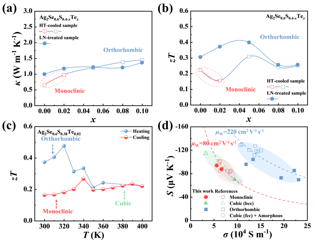 图6 Ag2Se0.6S0.4-xTex的热电性能。 HT冷却和LN处理的Ag2Se0.6S0.4-xTex样品的室温(a)热导率(κ)和(b)热电优值(zT)随Te含量的变化关系。(c) LN处理的Ag2Se0.6S0.38Te0.02样品在加热和冷却过程中的热电优值(zT)。(d) Seebeck系数和电导率之间的关系。虚线来源于单抛物带(SPB)模型,其加权迁移率µW分别为80 cm2 V-1 s-1和220 cm2 V-1 s-1。值得注意的是,本工作的立方相数据是在360 K下获得的,而其他所有数据都对应于室温测量。