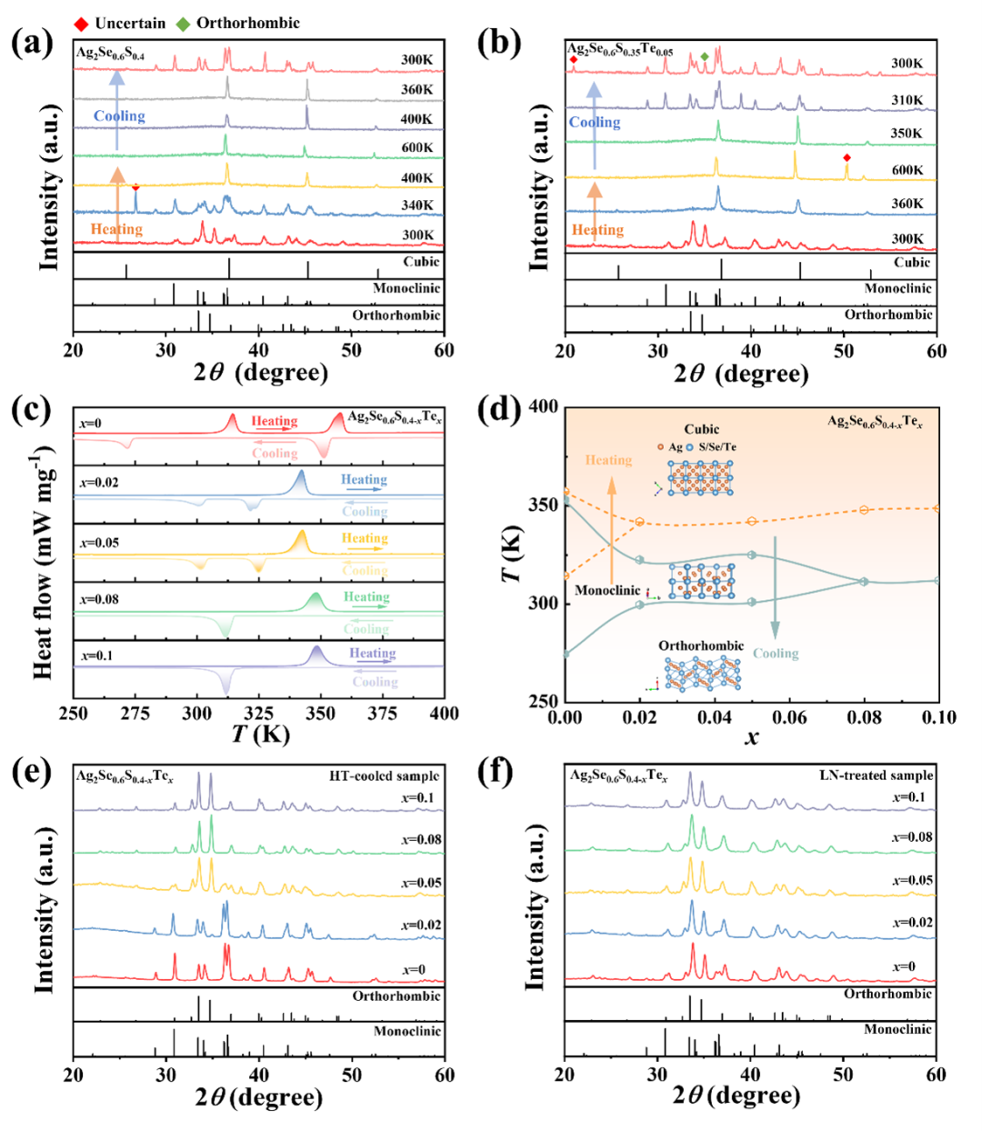 图4 晶体结构和相变。不同温度下测得(a) Ag2Se0.6S0.4和(b) Ag2Se0.6S0.35Te0.05的粉末X射线衍射(XRD)图谱。(c) Ag2Se0.6S0.4-xTex在升温和降温过程中的热流曲线。(d)根据Ag2Se0.6S0.4-xTex的热流曲线预测了其在250 K到400 K之间的相图。青色和黄色线分别代表了冷却和加热过程中的相边界。圆圈代表实验数据。插图显示出正交相、单斜相和立方相的晶体结构。从高温(记为HT-cooled sample)冷却的 (e)Ag2Se0.6S0.4-xTex样品和从液氮处理(记为LN-treated sample)加热的 (f) 样品的室温XRD图谱。