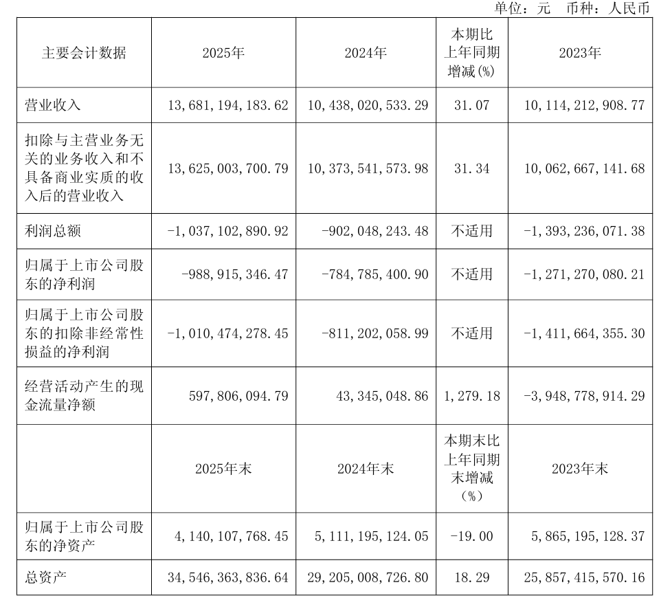 报告披露,2025年,电气风电实现营业收入136.81亿元,同比增长31.07%;实现归属于上市公司股东的净利润亏损9.89亿元,上年同期亏损7.85亿元;实现归属于上市公司股东的扣除非经常性损益的净利润亏损10.1亿元,上年同期亏损8.11亿元。