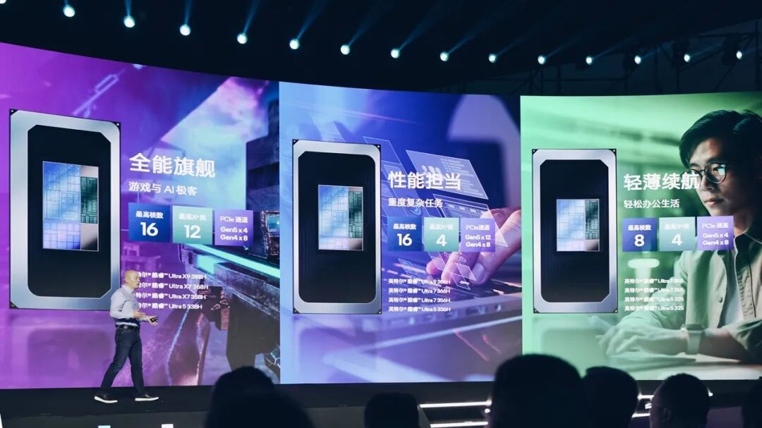 这三档名称基本也明确了它们的定位,“全能旗舰”强调“全能”,尤其出色的核显性能;“轻薄续航”则更瞄准轻薄本产品,重在更久的续航时间;“性能担当”着眼在搭配独显的笔记本产品,所以PCIe资源给的很充足(PCIe Gen 5 x12, PCIe Gen 4 x8)。
