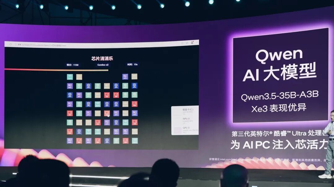 具体到应用上,除了表现它有能力做复杂PDF文档的梳理总结,给我们留下深刻印象的是Intel在现场演示让Qwen3.5-35B-A3B模型用HTML + CSS + JS写个“芯片消消乐”游戏(上图),包括图形元素都要求模型自主完成,最终以单HTML文件跑通——这放在1年前是个不可想象的事情。高宇评价说,该模型在多模态、复杂语言理解、代码生成、Agentic等方面的能力都非常优秀。