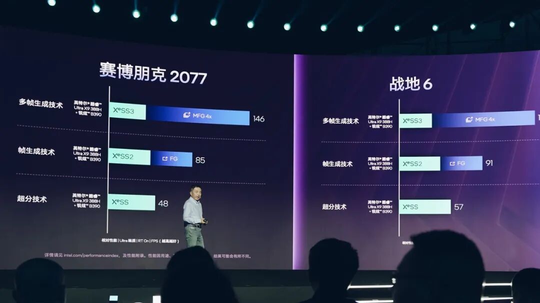 比如已经支持XeSS 3的《赛博朋克2077》和《战地6》,在不启用帧生成的情况下,以酷睿Ultra X9 388H来跑分别能达成48fps和57fps的帧率(1080p Ultra画质,开启XeSS超分);而启用4x多帧生成,帧数提升到146fps和145fps。
