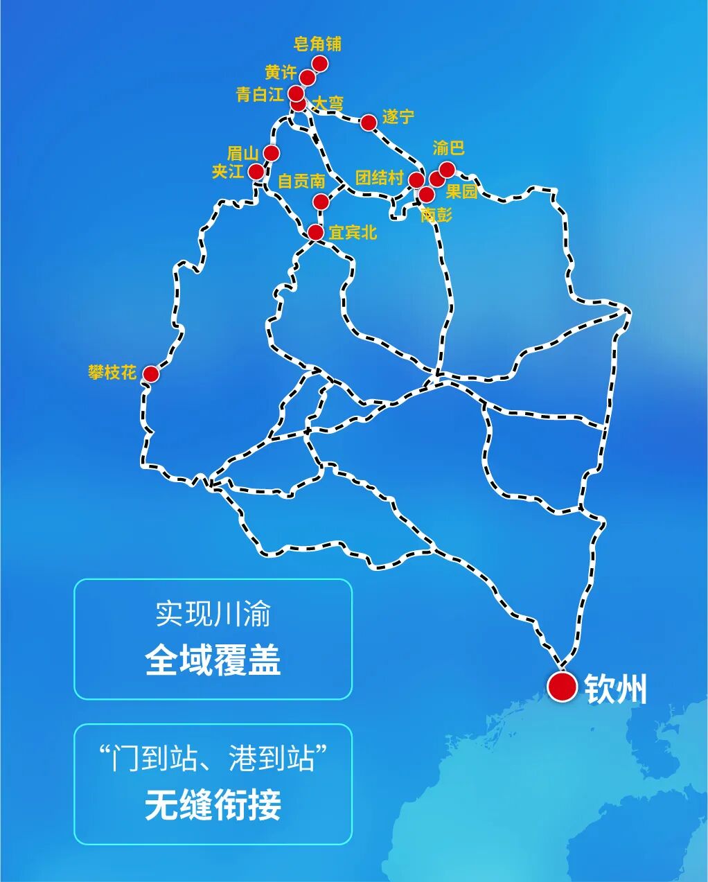四川站点:大弯站、眉山站、夹江站、自贡南站、宜宾北站、皂角铺站、青白江站、遂宁站、攀枝花站、黄许站