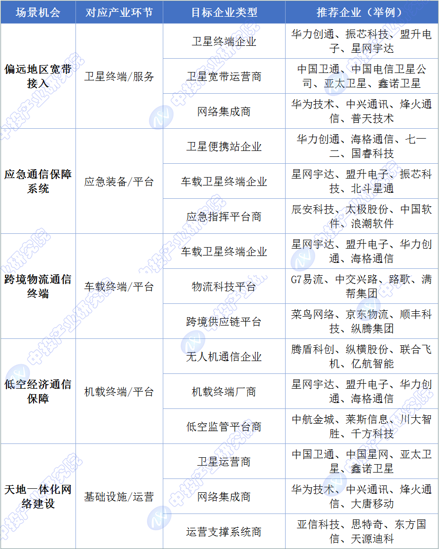 卫星互联网应用方向,重点聚焦偏远地区宽带接入、应急通信保障、跨境物流通信、低空经济通信等领域。中国卫通、华力创通、海格通信等企业可参与偏远山村网络覆盖和应急通信体系建设;星网宇达、腾盾科创等企业可支撑低空经济通信保障;华为技术、中兴通讯可参与天地一体化网络规划。