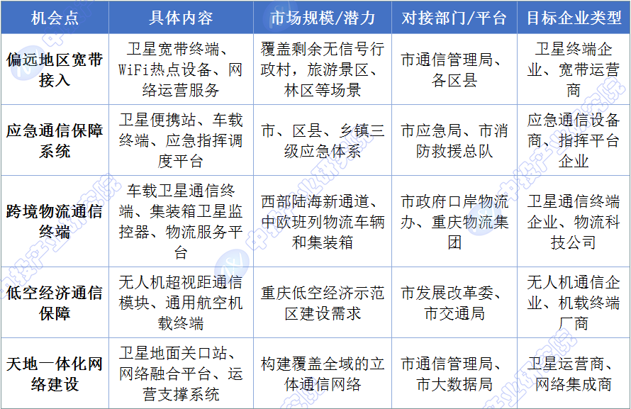 这批推荐企业呈现出鲜明的特点:它们多数已获得资本市场认可,具备成熟的技术产品和规模化应用能力,但尚未与重庆建立深度合作。对于重庆而言,这些企业正是“靶向招商”的理想对象——它们的技术能力与重庆偏远地区通信覆盖、应急通信保障、跨境物流通信、低空经济监管等场景需求高度契合,其业务方向精准对应市发改委《通知》明确的卫星互联网应用方向。