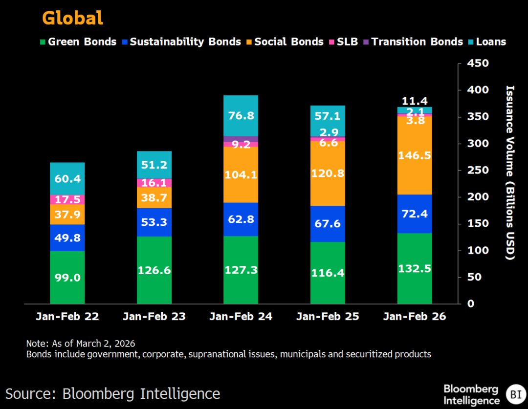 今年前两个月,全球可持续发展债务发行量连续第二年接近3,700亿美元,但仍低于2024年创下的纪录。绿色债券、社会债券及可持续发展债券的发行量均超过去年同期,其中社会债券以约40%的占比位居各券种之首。鉴于贷款交易数据的披露通常存在滞后,目前发行总量为3,690亿美元,实际上或许超越了2025年同期的3,715亿美元。与此同时,可持续发展挂钩债券和转型债券的发行量仍落后于去年同期水平。