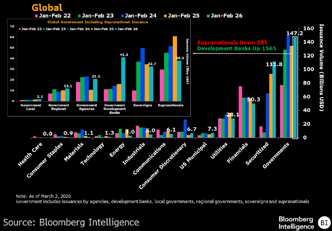 今年前两个月,包括超国家机构在内的政府债务以1,472亿美元的发行总量位居各板块之首,较去年同期增长9%。资产证券化交易以1,110亿美元排名第二,创历年前两个月最高发行规模。在政府板块中,超国家机构与主权债券发行量同比分别下降38%和6%;开发银行则表现亮眼,在德国复兴信贷银行债券于2025年8月纳入贴标范畴以来,相关发行量激增了156%。