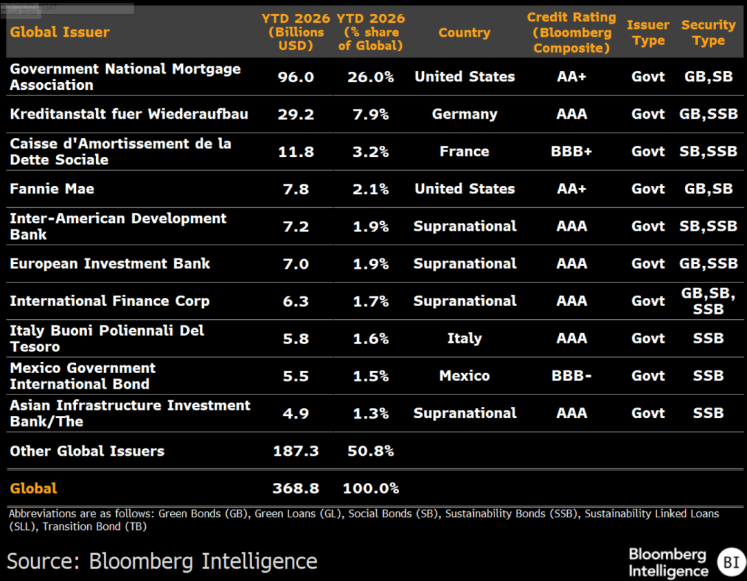 吉利美以960亿美元的发行量遥遥领先,稳居榜首。德国复兴信贷银行以292亿美元位居第二,该机构的开发银行债券自2025年8月起被贴上ESG标签。法国社会保障债务管理基金(CADES)凭借118亿美元的社会债券发行量排名第三。房利美以78亿美元的绿色债券和社会债券发行量位列第四。