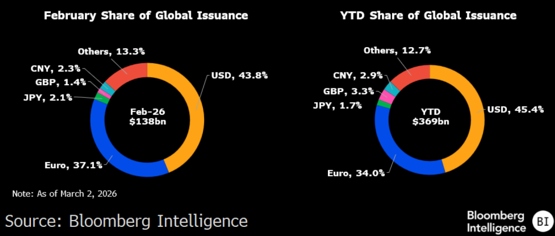 美元债券占发行总量45% 欧元债券占比不到34%