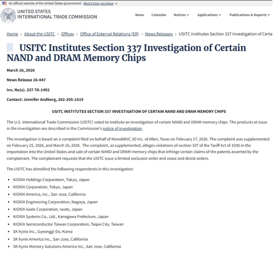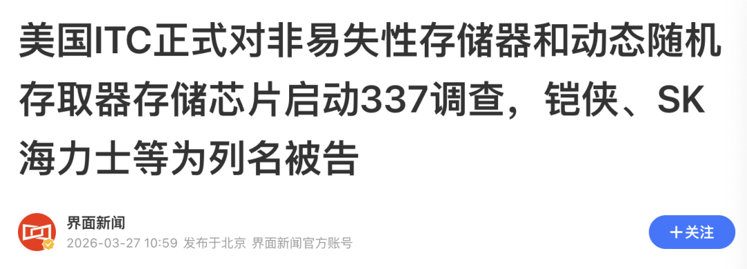 重磅!美国 ITC 突袭存储芯片,铠侠、SK 海力士遭 337 调查