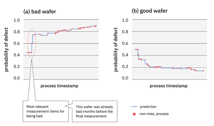 在这张图中,处理时间线上有一个点,模型预测到不良晶圆的概率会大幅上升——简而言之,这是一个“不良”预测。该分析意味着两件事。第一,该时间戳在某种程度上与该缺陷相关;第二,在最终测量的几个月前,该晶圆就被预测为不良。“所以,如果你知道这个情况,就可以中止生产过程,” Ide 说。