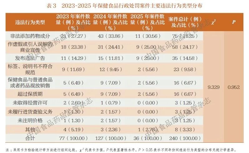 2023~2025 年期间, 保健食品行政处罚案件的违法行为类型分布较为集中( 表3)。非法添加药物成分(75 例, 占31.25%) 和虚假宣传(58 例,占24.17%) 是较为普遍的违法问题, 两者合计占比超过半数。其次是发布违法广告和标签、说明书不符合规范, 分别占比14.58%和9.58%。此外,还有部分案件涉及产品混放销售、超保质期等违法行为。