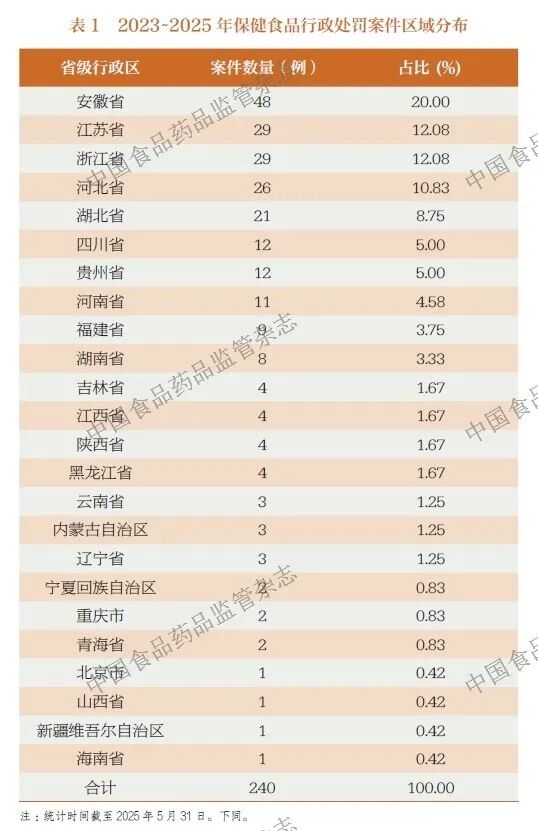 从地域分布看(表1),保健食品行政处罚案件集中分布在24个地区。从案件数量看,安徽以48 例居首(占比20.00%),江苏(29 例,12.08%)与浙江(29例,12.08%) 并列第二, 河北(26 例,10.83%)、湖北(21 例,8.75%)紧随其后。前5 个地区合计占全国案件总量的63.74%。中西部地区案件量相对较低,如贵州(12 例,5.00%)、河南(11 例,4.58%)及湖南(8 例,3.33%)等,合计占比不足15%。这表明保健食品行政处罚案件的基层执法效能在区域分布上存在差异性和不均衡性。
