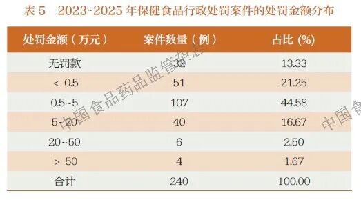 保健食品行业常以“健康”“养生”等概念进行高溢价营销。市场监管总局2021 年委托国家发展和改革委员会价格成本调查中心开展的研究显示,调查选取的直销企业保健食品平均毛利率为87%,远高于传统制造业[16]。目前,保健食品行政处罚多以固定金额或相对较低的违法所得倍数为计算基准,尚未建立与行业利润水平挂钩的动态调整机制,难以匹配保健食品行业的高利润特征。在查处通过虚假宣传或非法添加获取数百万元暴利的违法案件时,法定罚款上限可能仅为数十万元,形成“罚不及利”的悬殊差距。根据市场监管总局2025年通报的典型案例,虚假宣传类案件的罚款上限通常为20 万元,而食品安全违法案件的罚款可达货值金额的15~30 倍(依据《食品安全法》第一百二十三条),实际处罚金额从10 万元到数百万元不等[17]。同时,基层执法部门受限于调查权限与技术手段,往往难以精准核算违法者的全链条收益,导致罚款金额只能依据局部证据确定,进一步加剧了罚款数额与真实违法获利之间的失衡。这种制度性滞后与执行困难可能会弱化行政处罚的经济惩戒作用,难以对潜在违法者形成有效震慑,不利于营造健康有序的市场环境。
