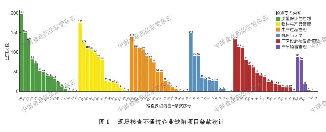 如表2 所示,物料与产品管理相关条款缺陷共计885 次,占比21.41%。根据《检查要点》,该部分共设14 条检查条款,其中关键项目1 条(49**),规定企业不得使用禁用原料、未经注册或者备案的新原料,不得超出使用范围、限制条件使用限用原料,并确保原料、外购的半成品、内包材符合法律法规、强制性国家标准及技术规范的要求;7 条为重点项目(*), 主要涉及供应商管理、物料审查、进货查验、工艺用水、产品合规、标签管理等方面;此外还有6 条属于一般项目。如图1所示,在现场核查不通过的企业中,物料与产品管理方面的高频条款主要为47*、50*,检查要点聚焦供应商管理和物料进货查验两方面的内容。
