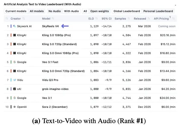 3 月 18 日,昆仑万维的视频大模型 SkyReels V4 登顶了全球权威评测平台 Artificial Analysis 的「文生视频(含音频)」第一位置,刷新了 Google Veo 3.1 在内一众海内外视频大模型的 SOTA 表现。