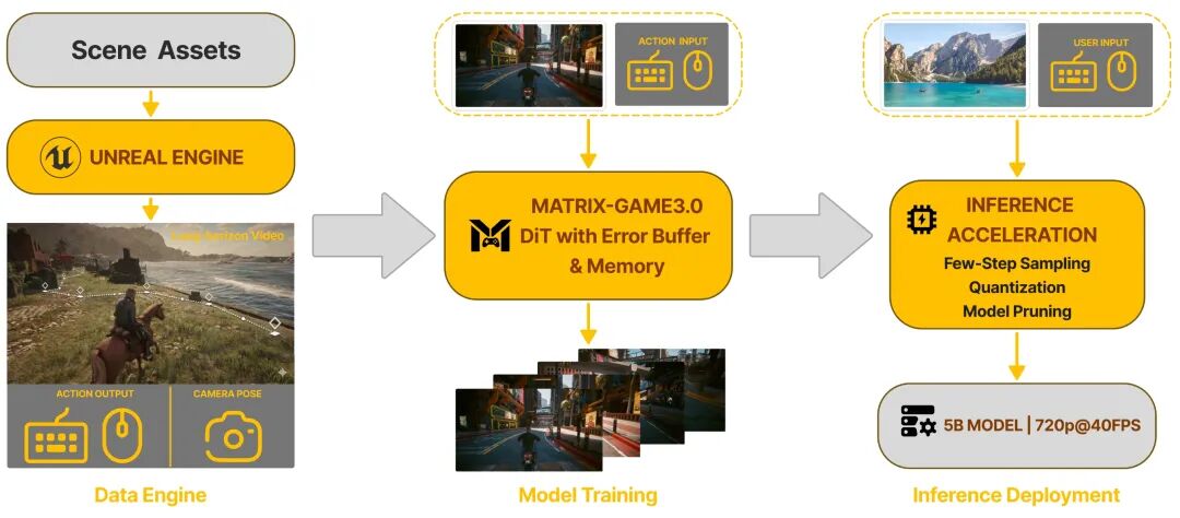 第三个是突破极限的实时推理能力。通过推理优化加速,小步采样并进行 KV Cache 这样的缓存机制,在 decoder 端又进行蒸馏和操作,Matrix-Game 3.0 的 5B 参数模型在 720P 分辨率下,生成速度最高可达 40FPS,这个数字意味着,用户的每一次操作,都能得到实时的画面反馈,真正实现了边生成边游戏的全新范式。