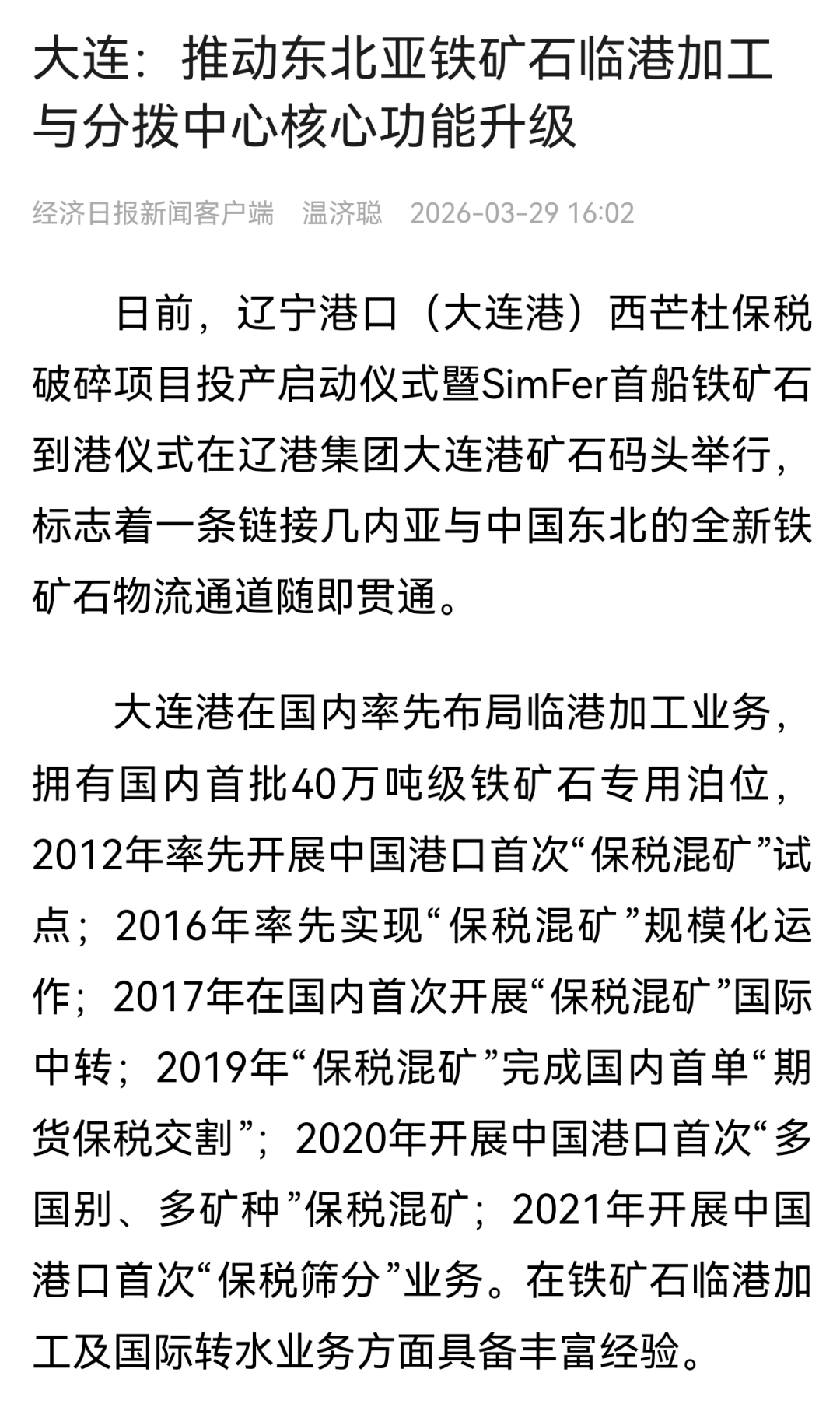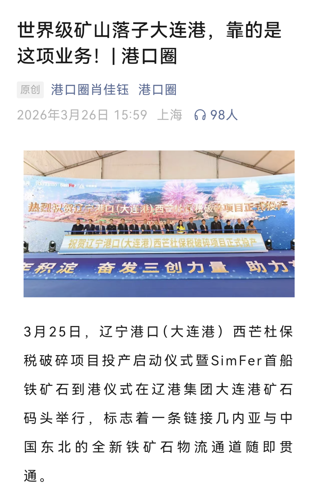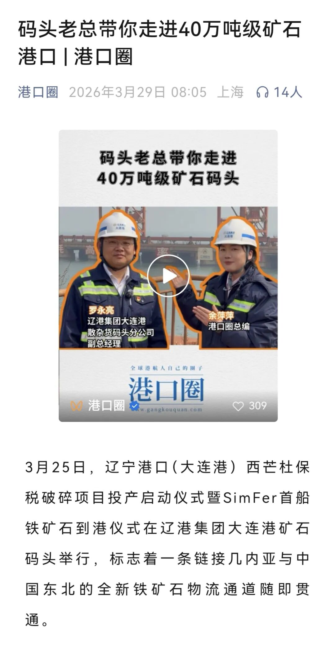 连日来,人民日报、中央广播电视总台、经济日报、中国日报、中国新闻社、大公报、辽宁日报、辽宁广播电视台、大连日报、大连广播电视台、中国交通报、中国水运报、港口圈等主流及行业媒体,走进大连港、营口港,围绕西芒杜铁矿石保税破碎项目投产、东北地区最大化肥中转枢纽保障春耕、畅通东北全域产业物流脉络等进行集中报道,多维度呈现辽港集团主动服务国家资源安全、粮食安全、东北全面振兴等的责任担当与亮眼成绩。