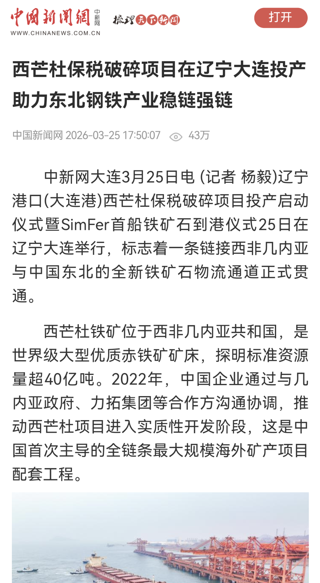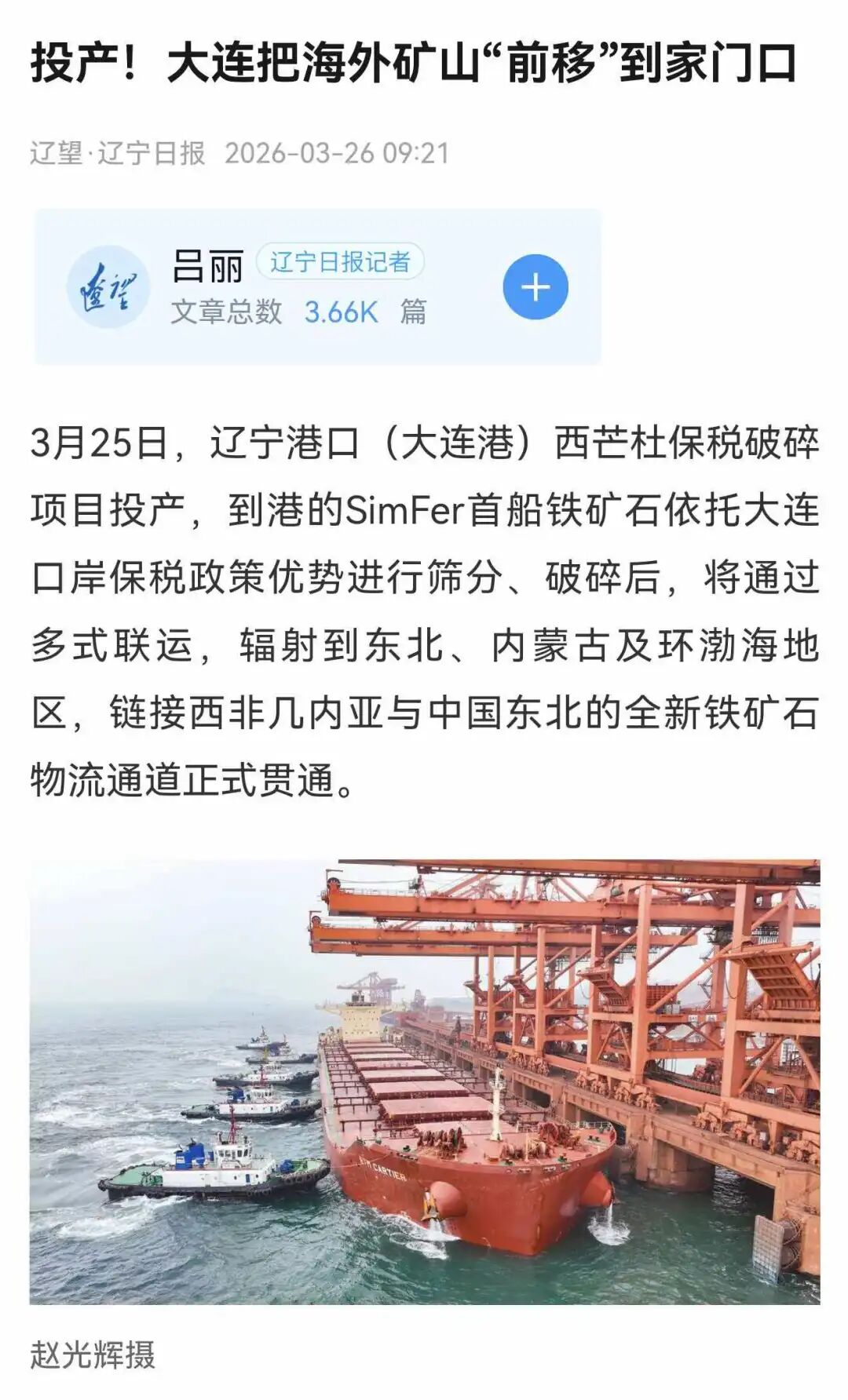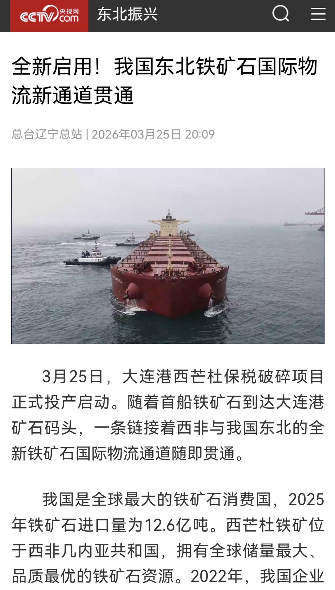 3月22日,“卡地亚”轮满载非洲几内亚的铁矿石行经万里,抵达大连港大窑湾港区;3月25日,“润广7”轮装载湖北的磷肥穿江达海,驶入营口港鲅鱼圈港区。两艘货轮的先后“到访”,不仅为东北大地送来工业发展与农业生产的关键物资,也将各级媒体的“聚光灯”吸引而至……
