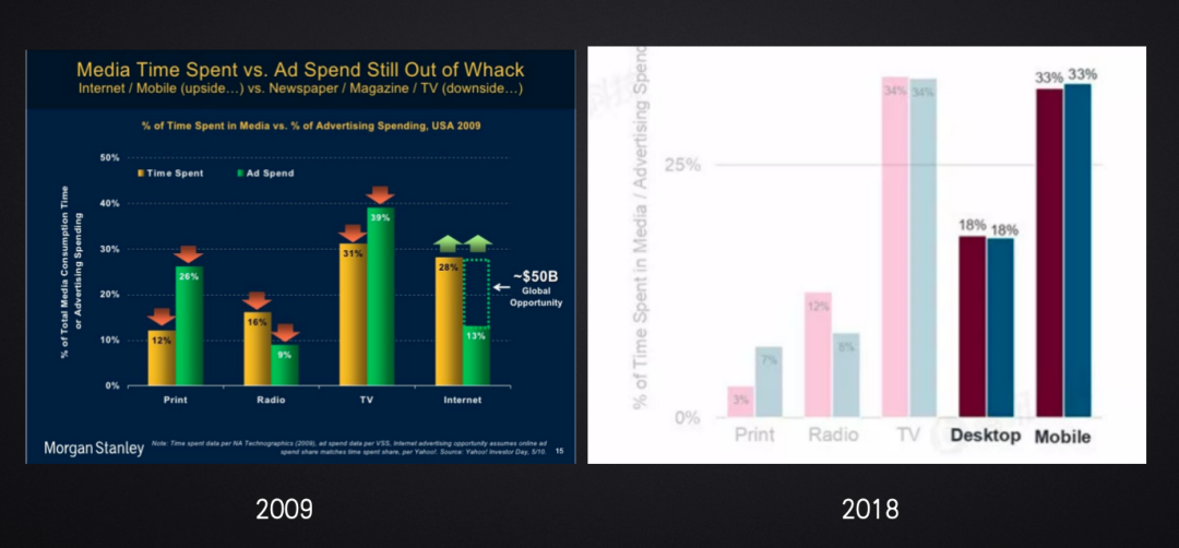 互联网从2009年的13%上升到了2018年的51%,而互联网也正好占据了人们51%的时间。(尽管这些数据不是最新的,但广告收入和时长匹配的大逻辑是清晰的)