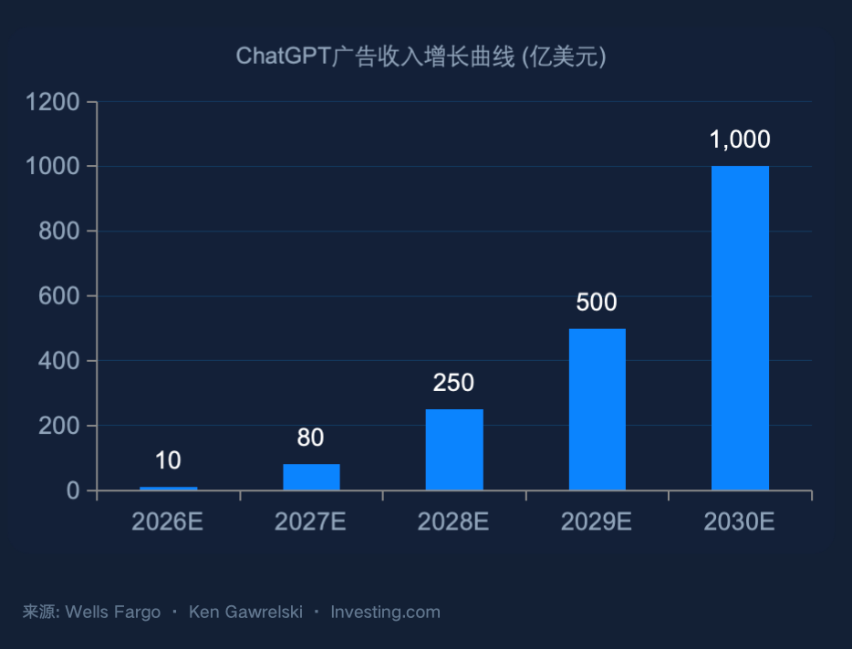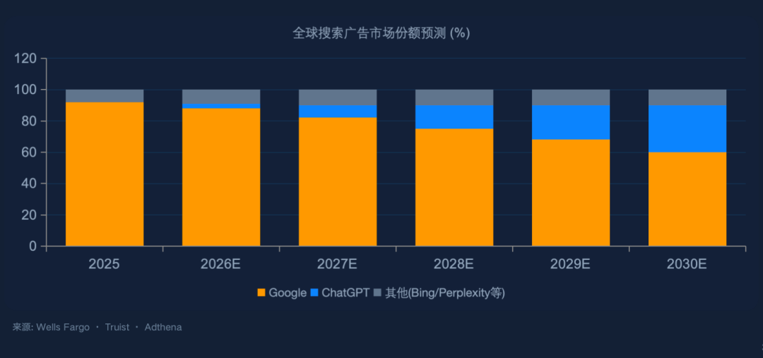 根据富国银行分析师Ken Gawrelski的预测:2030年ChatGPT能占据全球搜索广告30%。