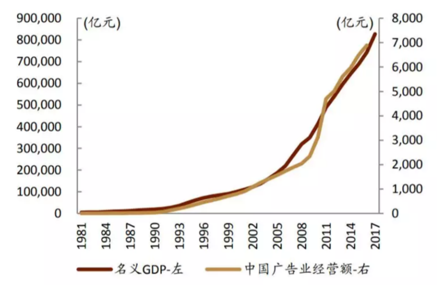 中国也一样,广告收入曲线和名义GDP曲线在调整后基本是重合的——