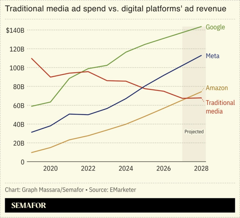 到2028年,传统媒体广告的总收入加起来,都比不上亚马逊一家的广告收入了。