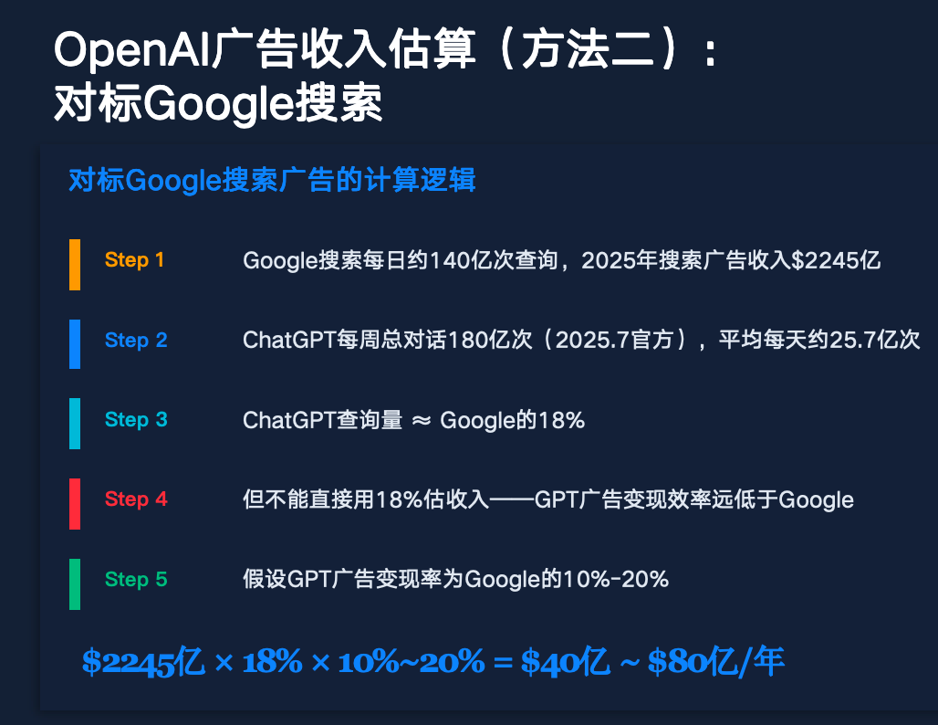 两种方法的估算没有数量级上的差异:结论就是OpenAI第一年的广告收入大概率在$20-80亿/年。
