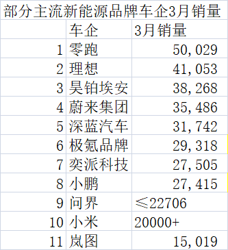 问界未单独披露品牌销量。根据赛力斯的产销快报,该公司3月新能源汽车销量22706辆,这意味着问界的销量不会高于这一数字,但具体在2万以上还是以下尚无定论。