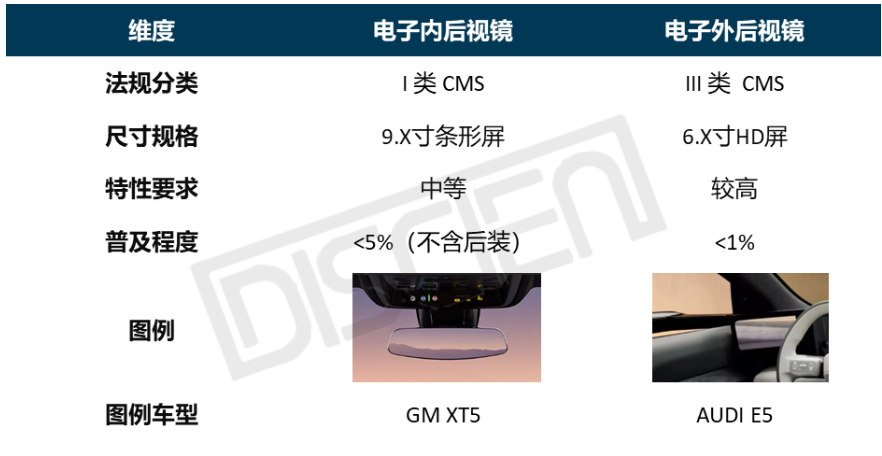 在乘用车领域,CMS 主要呈现为两类方案。其一是作为视野辅助件的电子内后视镜(属于 I 类间接视野装置),多采用 9.1 英寸、9.3 英寸等条形显示模组,安装于挡风玻璃正上方的传统内镜位,由于其技术冗余度要求较低,目前在后装市场渗透率较高。其二则是作为核心安全件的电子外后视镜(属于 III 类间接视野装置),多采用 6 英寸、6.7 英寸、 7 英寸等高清(HD)模组,呈现左右对称的双屏布局,安装于A柱下方。相比内后视镜,III 类 CMS 对模组性能有着苛刻的要求,在亮度、低延时以及可靠性等维度设立了高门槛。