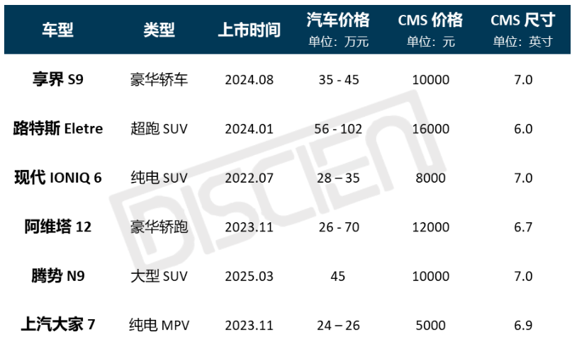 目前,在 35-50 万元的豪华车领域,电子内后视镜已展现出较高的渗透率,约28%(车型渗透情况,不代表市场销量渗透率)。随着成本下探,前装增长红利逐步渗透至中低价位车型,未来三年电子内后视镜有望见证其从溢价配置向普及配置的身份转变。然而,电子外后视镜的商业化之路依然坎坷。目前仅活跃于路特斯、享界、阿维塔、Audi等品牌中,动辄万元的选装成本折射出供应链初期的沉重压力。面对用户习惯的挑战与严苛的功能安全验证,车企的态度表现出显著的战略性摇摆:既不愿放弃智能化高地,又受困于投入产出比的博弈,使得 CMS 现阶段仍处于防御性试水期。