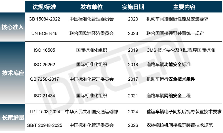 根据国家标准《GB 15084-2022 》机动车辆间接视野装置性能和安装要求的定义,间接视野分类分为七类,如图一所示。CMS是指通过“摄像头+控制器+显示器”组合取代传统光学镜的整套视觉系统 。它打破了传统光学反射的物理局限,将视野获取从被动的“反射”提升为主动的“数字处理”,通过感知层、传输层、计算层、显示层、交互层、支撑层六层集成化架构,解决了传统镜在复杂环境下“看不见、看不准、反应慢”的痛点,也使得产业链价值正经历向“算法集成”与“座舱域控”的进化 。