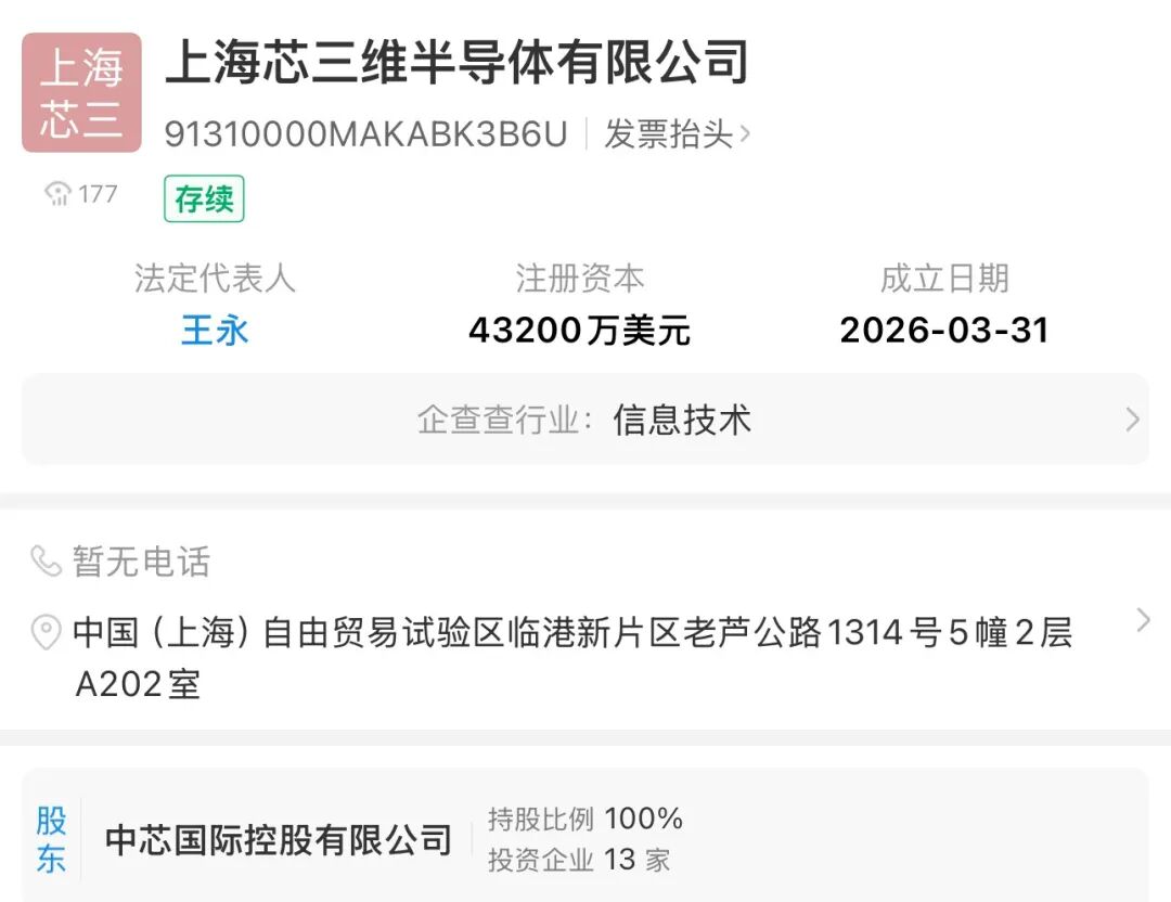 4月1日电,天眼查工商信息显示,近日,上海芯三维半导体有限公司成立,法定代表人为王永,注册资本4.32亿美元(约30亿人民币),经营范围包括集成电路制造、集成电路销售、集成电路芯片及产品制造、集成电路芯片及产品销售、货物进出口、技术进出口等。