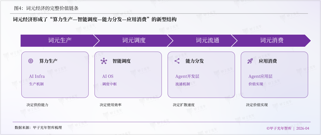 进一步来看,这一范式跃迁还意味着价值载体的变化。在传统经济中,价值通常以商品或服务的形式体现;在数字经济中,价值更多体现为数据与平台流量;而在词元经济中,价值将以“能力调用次数”或“词元消耗量”的形式存在。