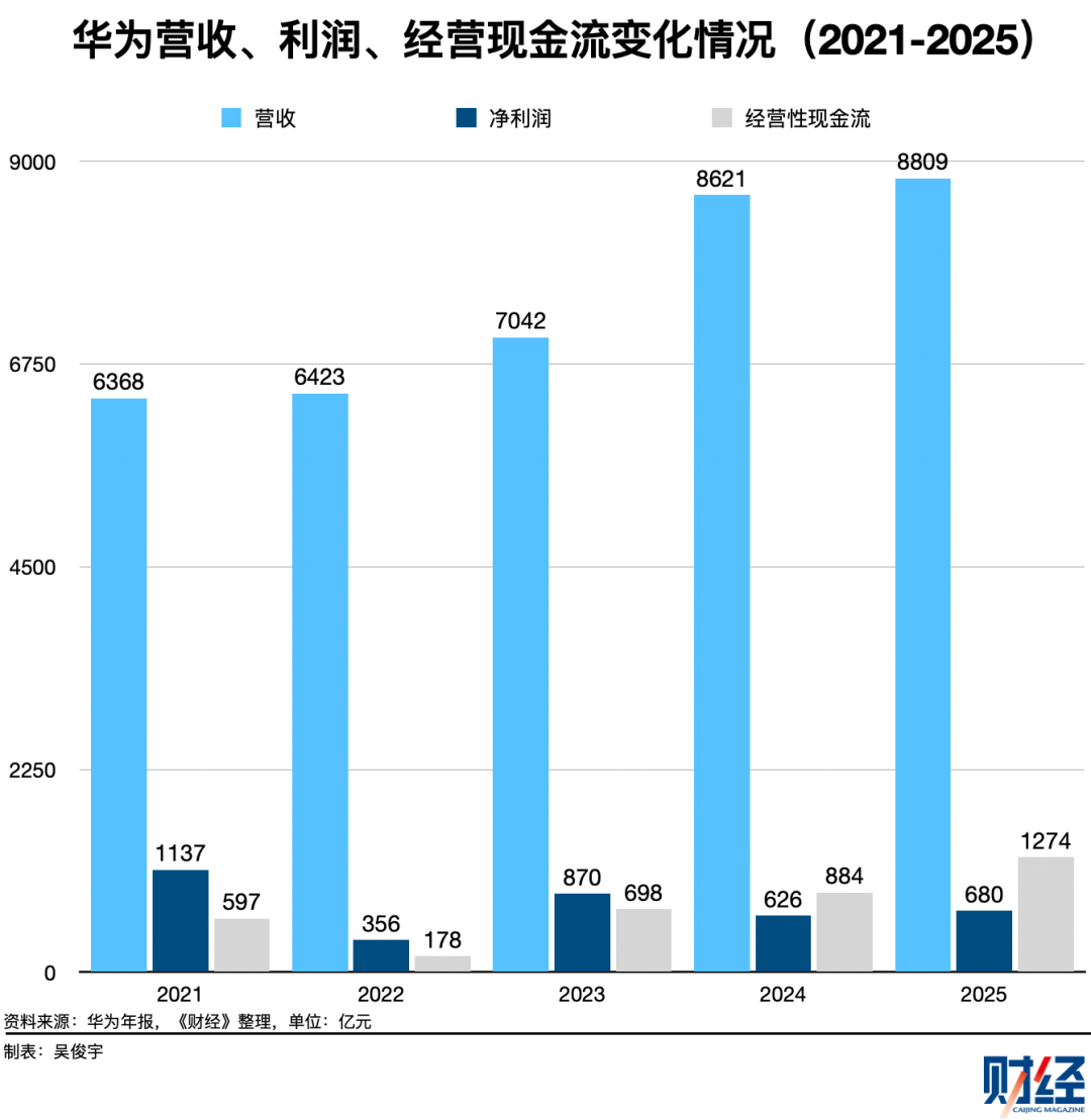从年报数据看,2021年至2025年,华为销售收入从6368亿元增长至8809亿元,累计增幅近40%;净利润在经历2022年的低谷后,连续三年稳定在600亿元-680亿元区间;经营活动现金流从2022年的178亿元回升至2025年的1274亿元;资产负债率从2023年的59.8%(近五年最高)降至55.0%。从这组数据看,华为在恢复增长的同时,整体财务状况保持稳健。