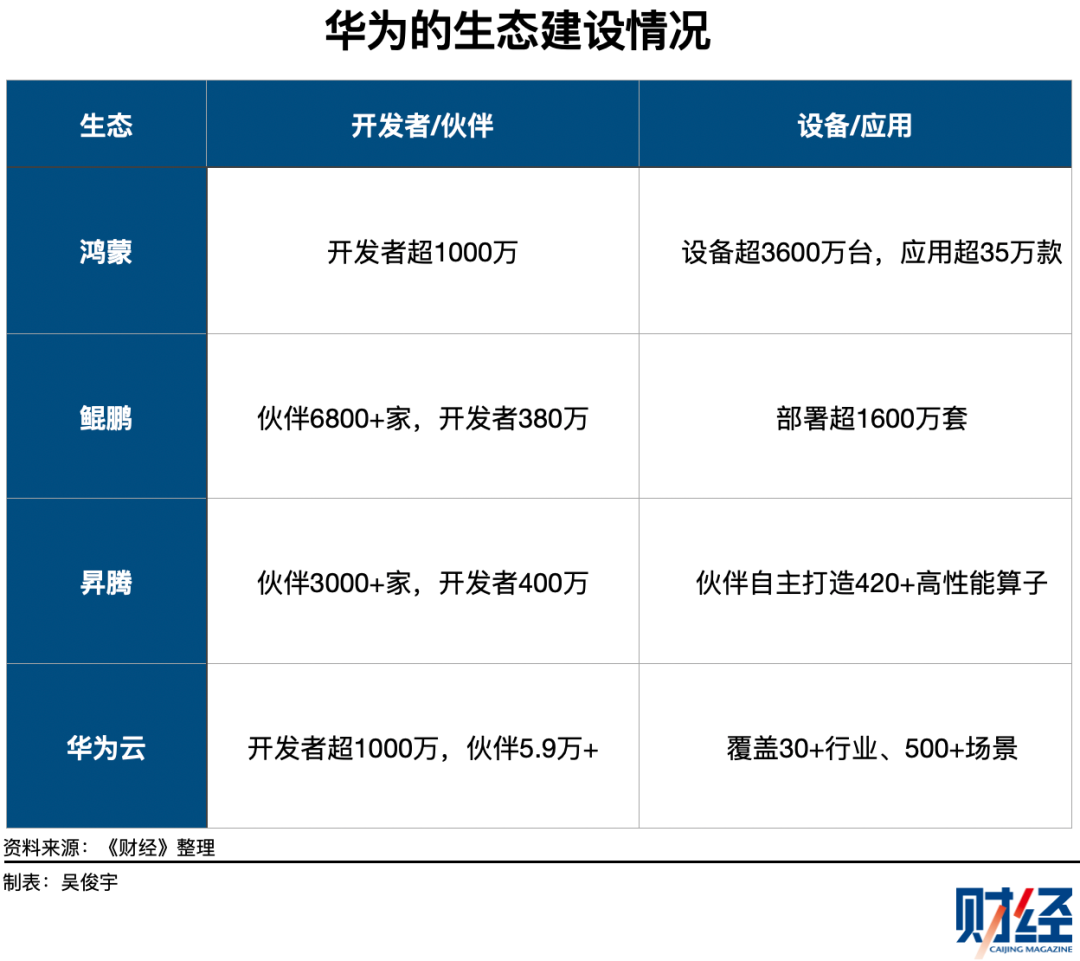 计算生态方面:鲲鹏发展6800多家合作伙伴、380万开发者;昇腾已发展3000多家合作伙伴、400万开发者。openEuler系操作系统累计部署超过1600万套,openGauss社区版本下载量突破550万次。这些操作系统的演进和维护,已经由开源社区承接,华为只是贡献者之一。