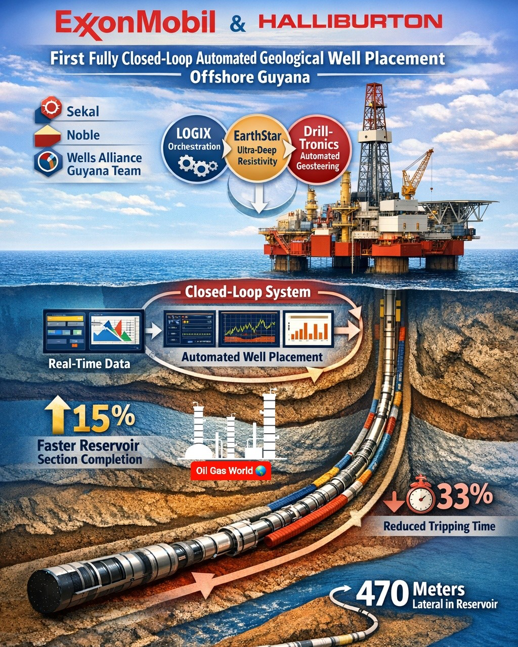目前,整合后的Halliburton-Sekal 自动化解决方案已在全球多个项目落地应用,可实现井筒交付时间最高缩短25%,起下钻时间减少33%,储层段作业效率提升15%,同时大幅降低人为操作风险与非生产时间。就在今年3月中旬,哈里伯顿公司与Sekal、Noble合作,在埃克森美孚圭亚那项目一举实现了业内首次完全自动化的地质导向完井作业,并完成了全自动的钻机操作。