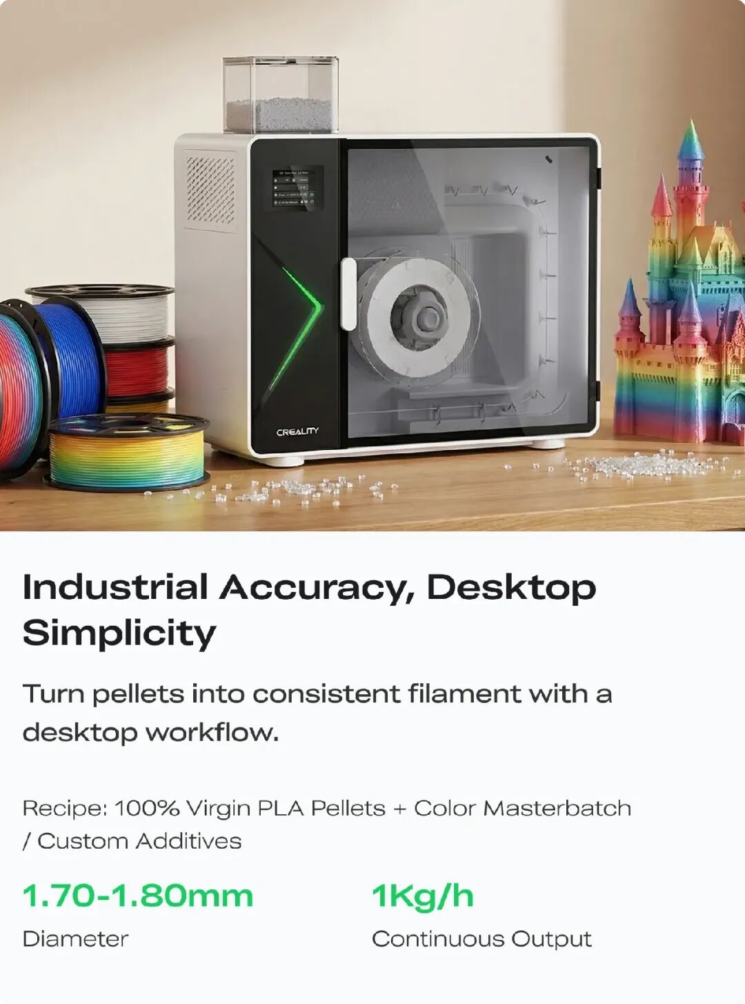 耗材生成机M1:可将塑料颗粒高效挤出为1.70-1.80mm的标准打印线材,以每小时1kg的稳定产能,实现工业级精度与桌面级便捷的完美融合
