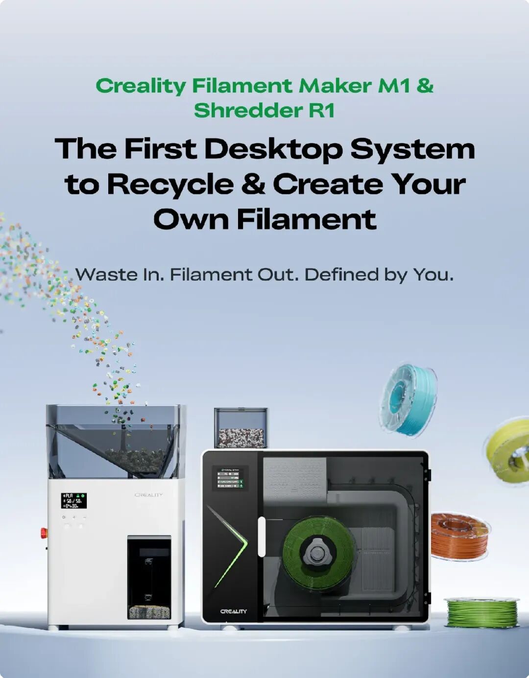 作为创想三维3D打印生态的重要创新成果,M1+R1核心定位首款桌面级耗材生成系统,精准填补消费级3D打印材料回收领域的空白,完善了“打印-回收-再打印”的生态闭环,为全球创作者提供了更完整、更可持续的3D打印解决方案。