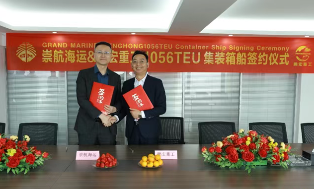 近日,崇航海运有限公司与宁波鹏宏船舶重工有限公司举行1056TEU集装箱船建造合同签约仪式,新船预计将于2027年一季度交付。