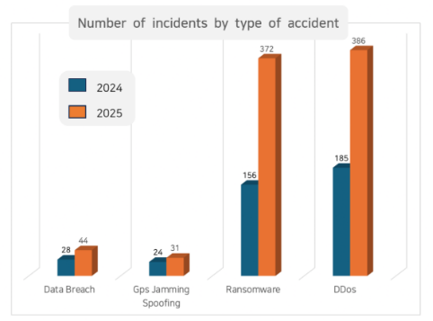 报告中指出,随着AI人工智能、5G等技术与船舶行业融合应用发展,越来越多的智能船舶投入运营,用于船舶实时监控、远程维护和远程操作的数据流量呈指数级激增,在提高船舶运营效率的同时也扩大了航运业的网络攻击面。据统计,2025年发生的海事网络安全事件数量达到828件,较2024年的408件激增103%,其中分布式拒绝服务攻击(DDoS)、勒索软件和恶意软件感染占绝大多数,其增长率在过去一年中翻了一倍多。
