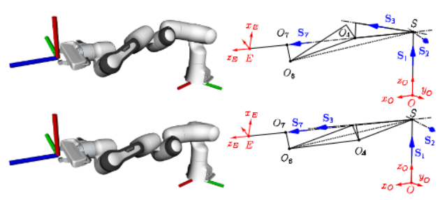 图2:肩轴与 S7 奇异位形下的肘部上位与肘部下位解。