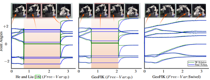 如下图 所示,约10秒处,HeLiu 与以q₇为自由变量的GeoFIK均出现求解失效,机器人运动中断